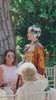An expressive celebration of cultural craftsmanship and artisanal layering. This look features a one-of-a-kind peplum coat composed of a vintage embroidered mini cotton jacket sourced from the Ethnological Museum of Thrace. The peplum and lower panels are constructed from striped Uzbek silk, while playful handmade flower lapels and tassel belt details add sculptural elegance. The bandeau top, boxy and ruffled, is crafted from vintage Indian embroidered cotton with delicate shoulder straps. Coordinated with flared silk sari pants and a hand-painted straw bucket bag adorned with ®Swarovski crystals, this ensemble reimagines tradition with modern whimsy.