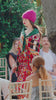 This vibrant summer look features a coordinated top and skirt set made from vintage Indian cotton from the 1950s. The puffed-strap top and long ruffled skirt offer a breezy silhouette, ideal for warm days. Layered over the ensemble is a striking triangle stola—crafted from a rare hand-embroidered textile from 1900s Uzbekistan, trimmed with tassels and fringes, and lined with vintage wool-silk duchesse fabric for structure and contrast. The look is completed with a hand-painted straw bucket bag, wrapped in silk and adorned with Swarovski® crystals, adding a playful yet luxurious finish.