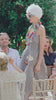 A joyful celebration of texture, color, and imagination. This shoulder-free bustier dress is crafted from vintage raffia fabric panels, featuring sculptural lines and silk-piped seams that accentuate the silhouette with elegance and ease. It is paired with handpainted OOAK Clay Jewelry—necklace and brooches—each a wearable piece of art. Completing the look is a whimsical clay basket, delicately handwoven and finished with a vintage silk scarf handle.
