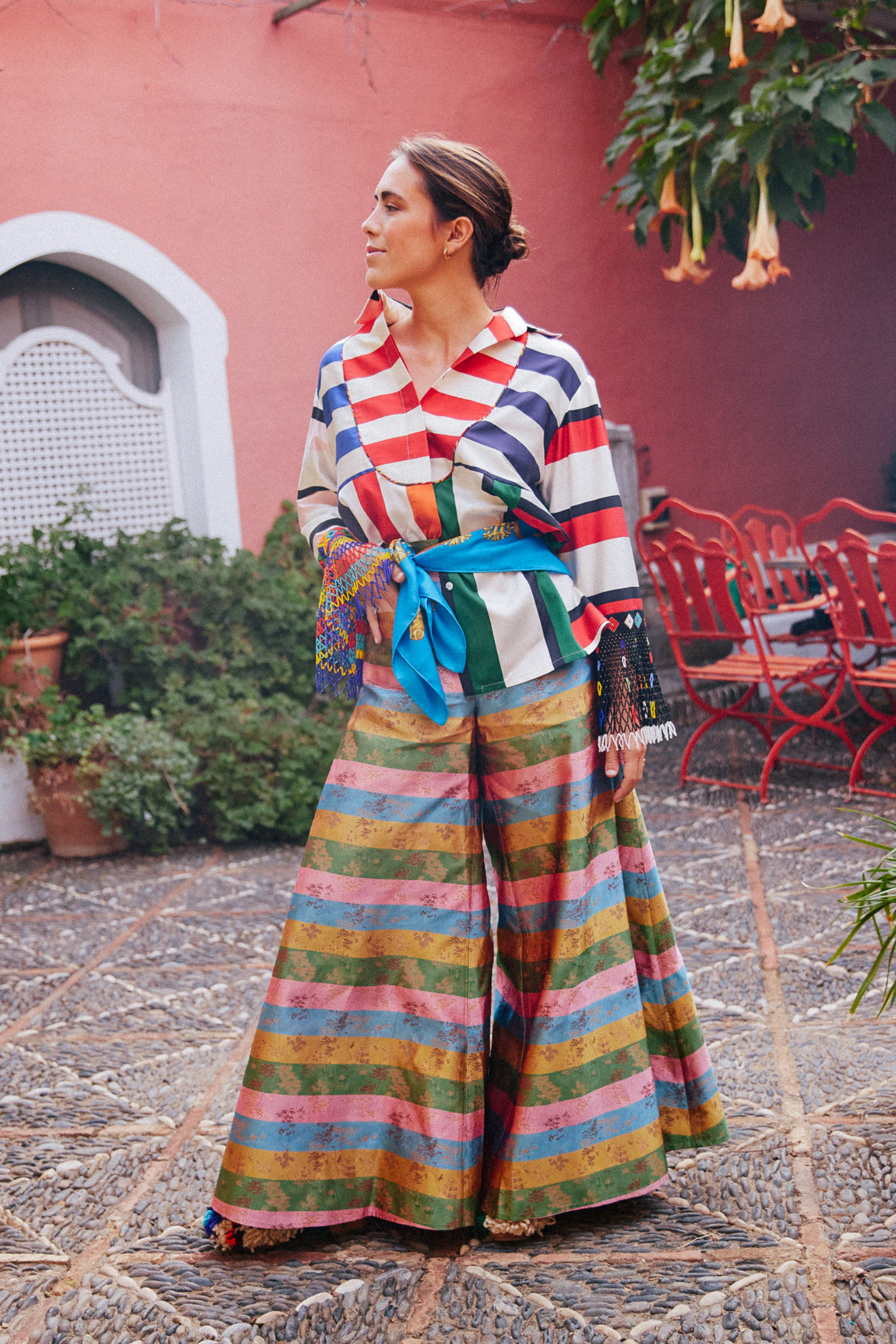 Product Details: Super wide leg palazzo pants, embroidered silk fabric, fitted waistband, back zipper