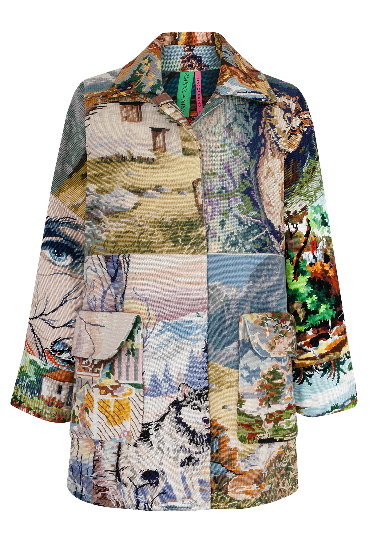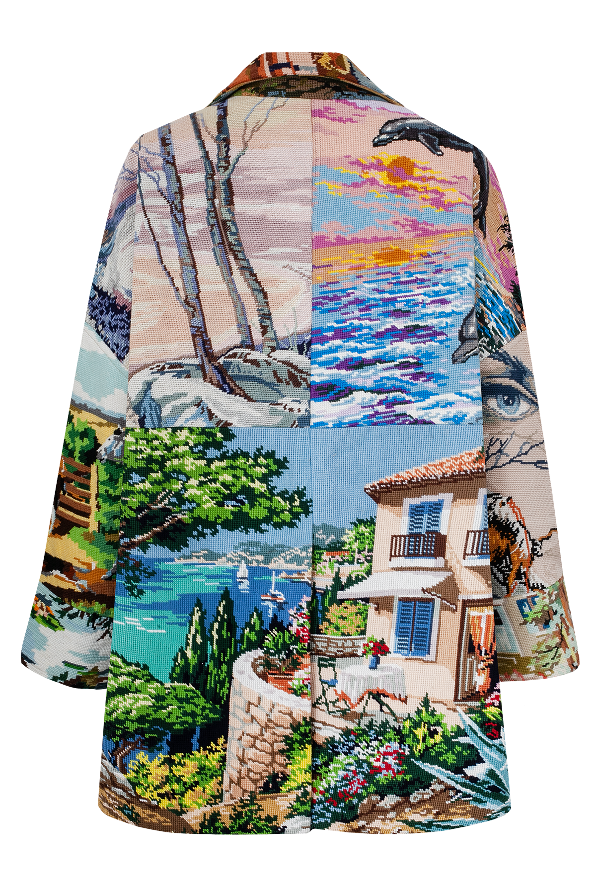 The One-of-a-kind Caban Jacket Embroidery is an oversized statement piece that beautifully blends craftsmanship and timeless design. Made from vintage handmade Gobelin embroidery pieces from the 1960s and 70s, its structured silhouette is elevated by a wide collar, front pockets with flaps, and a hidden button placket for a refined finish. The interior is fully lined with luxurious vintage silk, offering a soft contrast to the textured wool-cotton mix exterior. Effortless yet striking, this jacket is designed to make an impression.