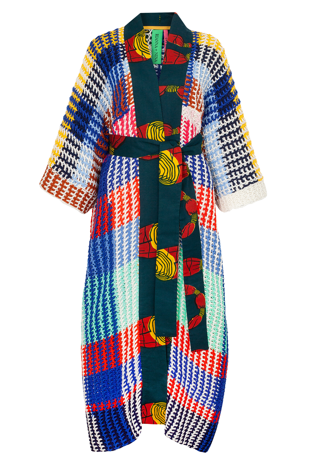 The One-of-a-kind Kimono Crochet is a statement piece that carries the warmth and artistry of the 1970s. Crafted from a handmade vintage crochet blanket in soft wool, it features a relaxed kimono silhouette that drapes beautifully on the body. The opening and neckline are finished with a contrasting block print cotton wax facing, adding depth, character, and a touch of vibrant pattern. Unlined and effortless, this piece brings together craftsmanship, comfort, and timeless individuality.