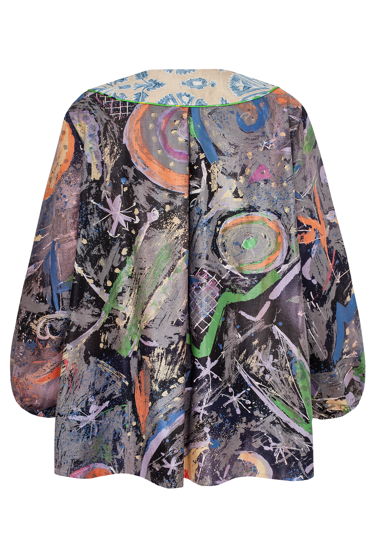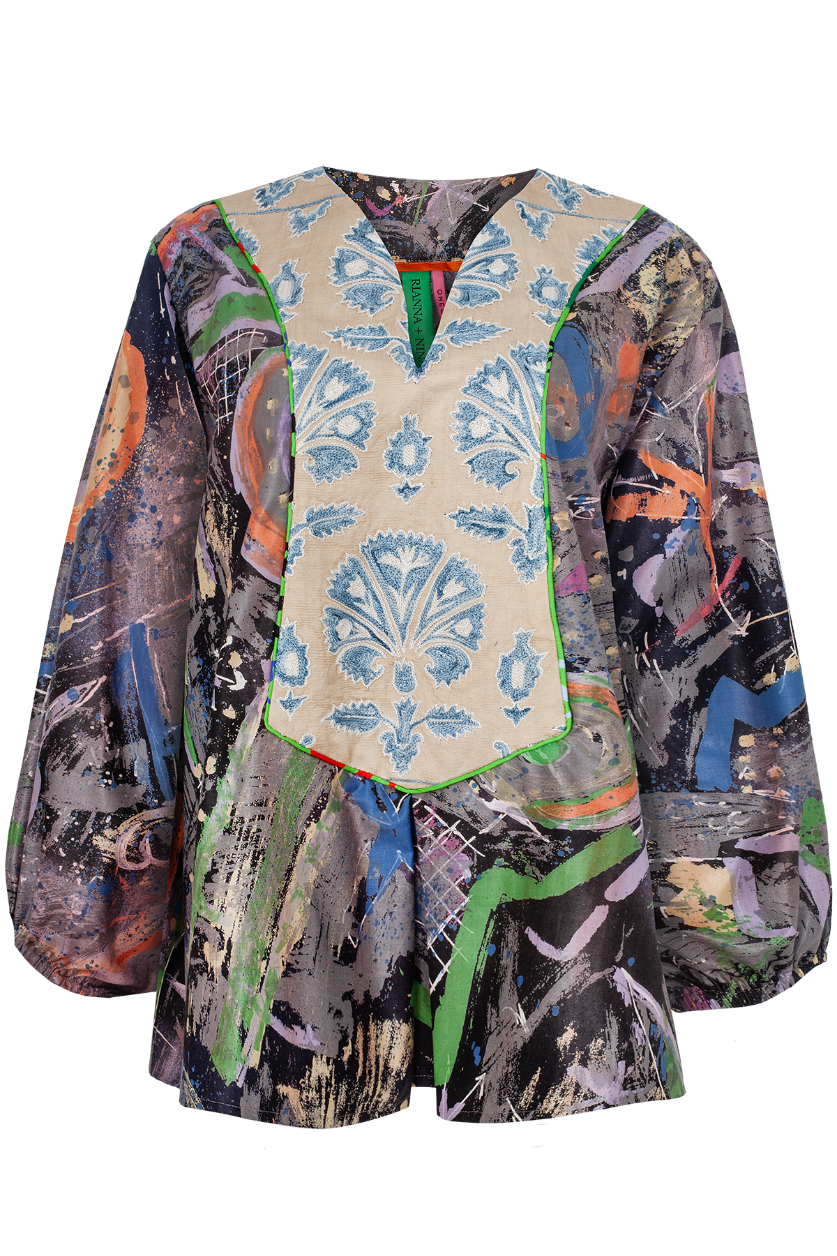 The One-of-a-kind Long Plastron Blouse Cotton Lux is a graceful, wide-swinging silhouette designed for effortless movement. It features long sleeves gathered softly at the cuff and a refined V-neckline framed by an elongated plastron front panel. The front is crafted from vintage Uzbek silk embroidery, making each piece uniquely rich in texture and history. The blend of volume and delicate detailing creates a statement that feels both relaxed and elevated.