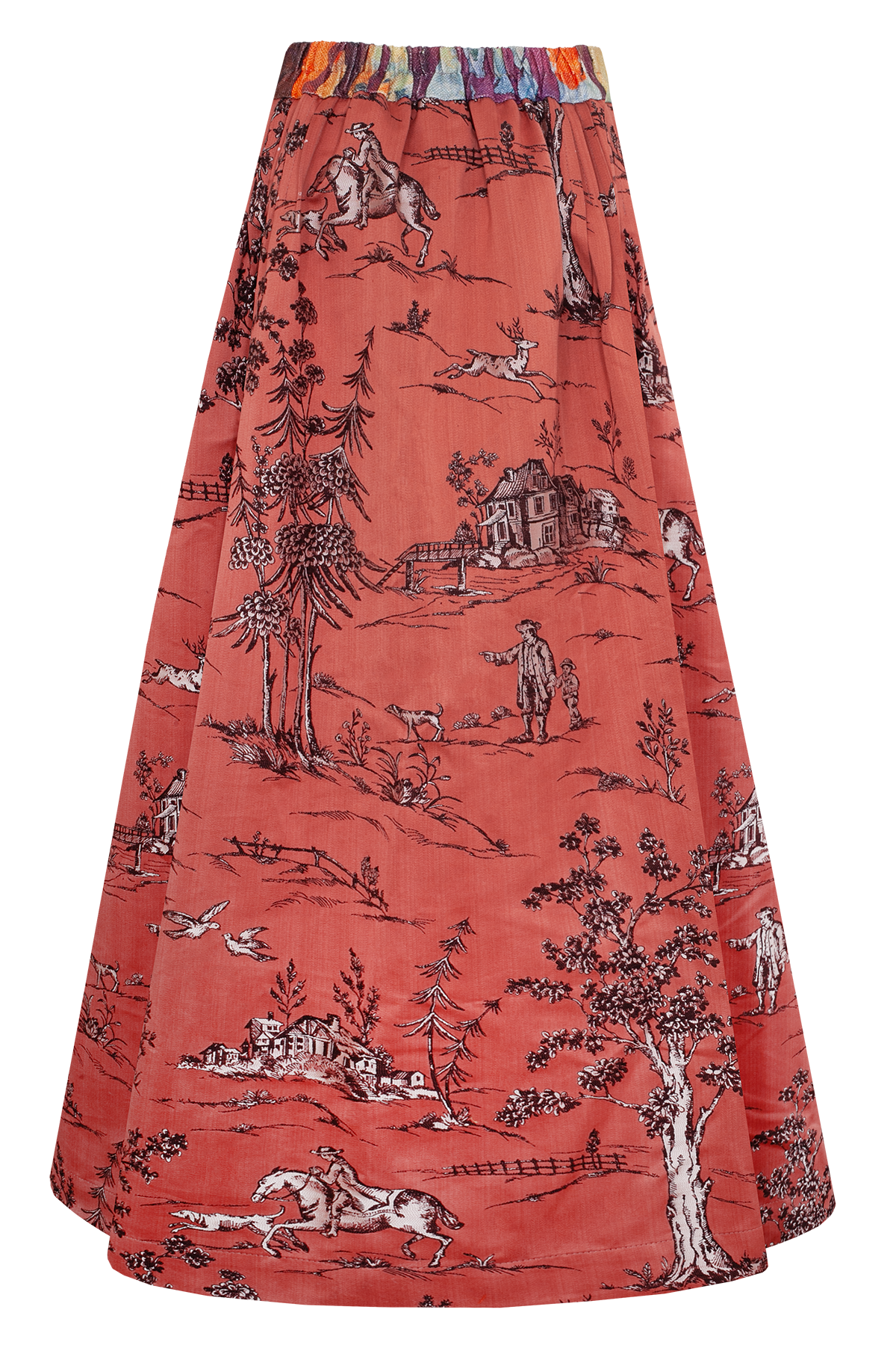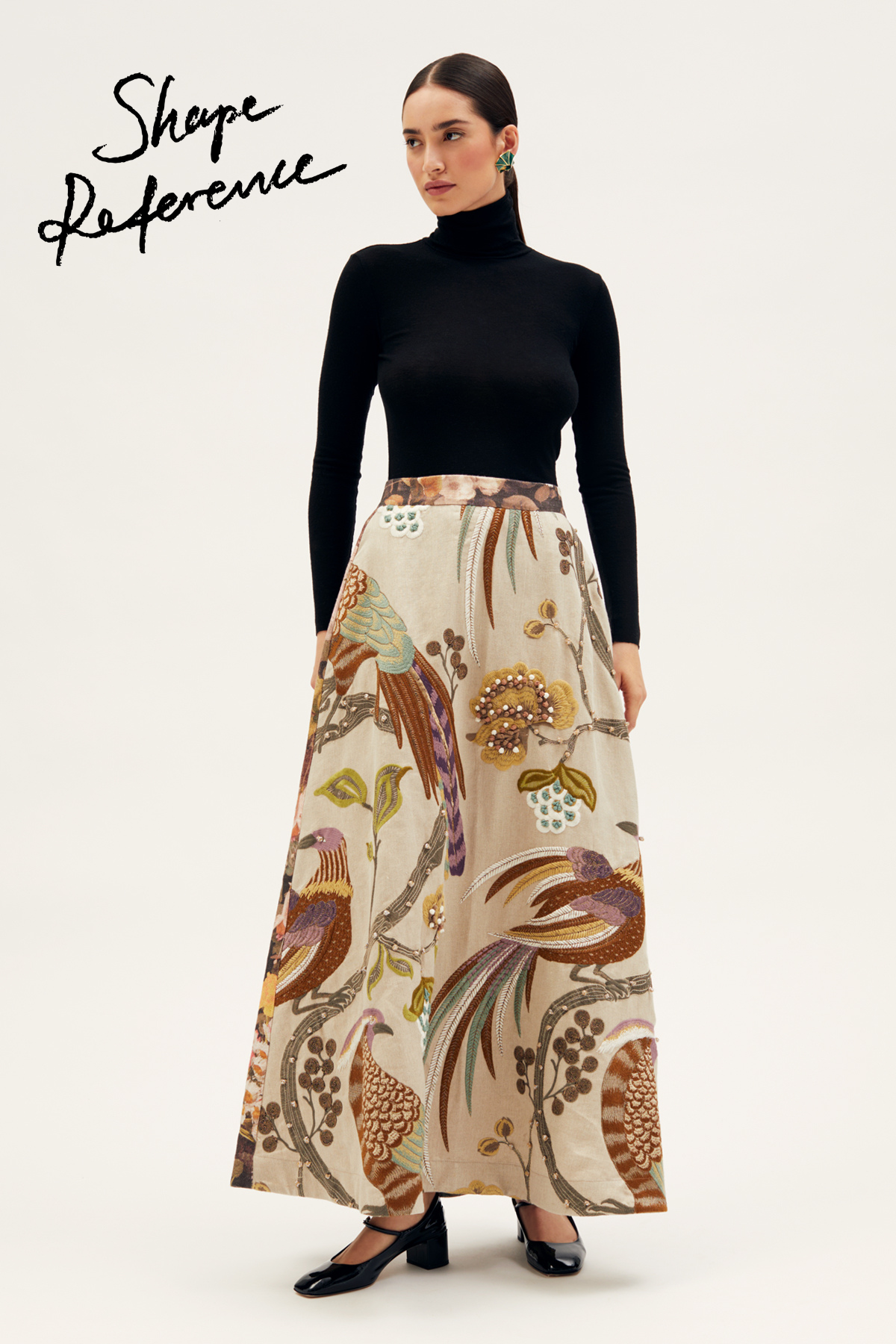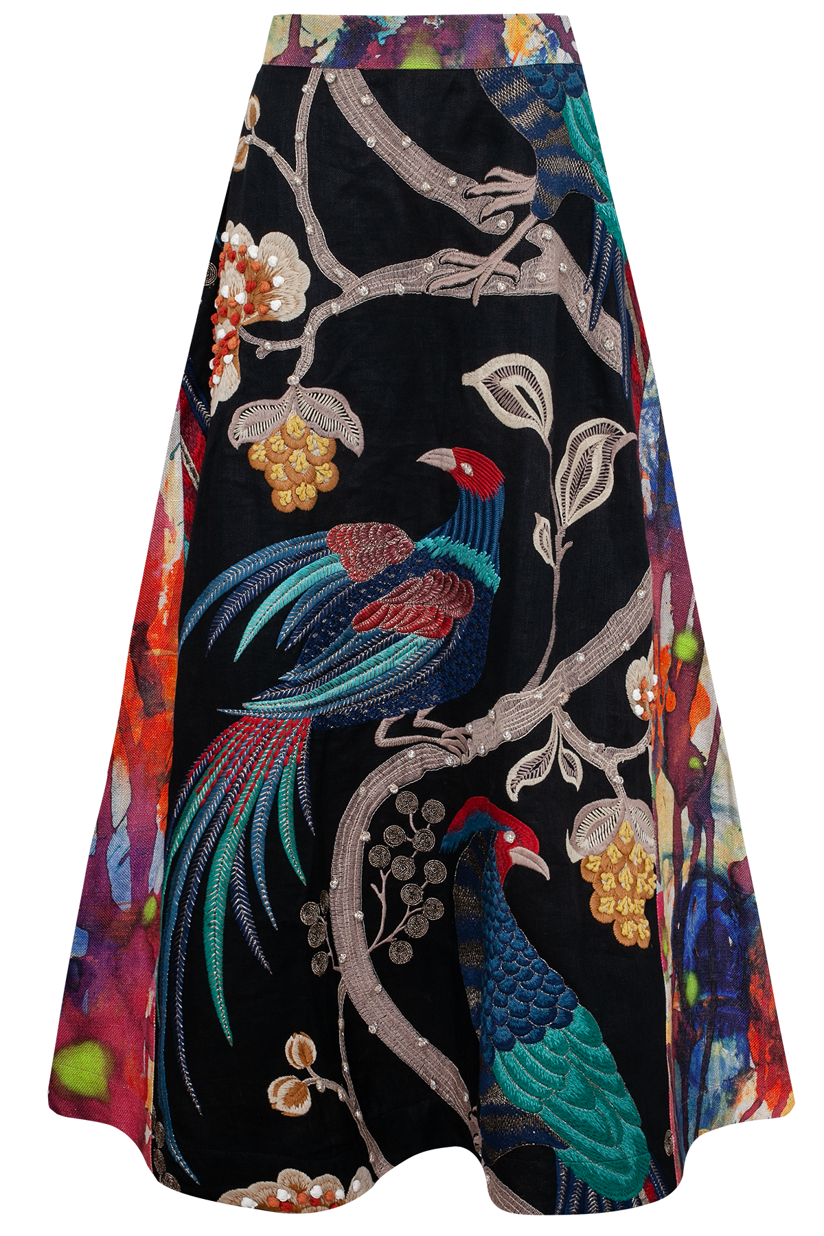 Product Details: A-line silhouette, embroidered linen mix front, printed linen back, small tucks at back, waistband with side zipper, unlined