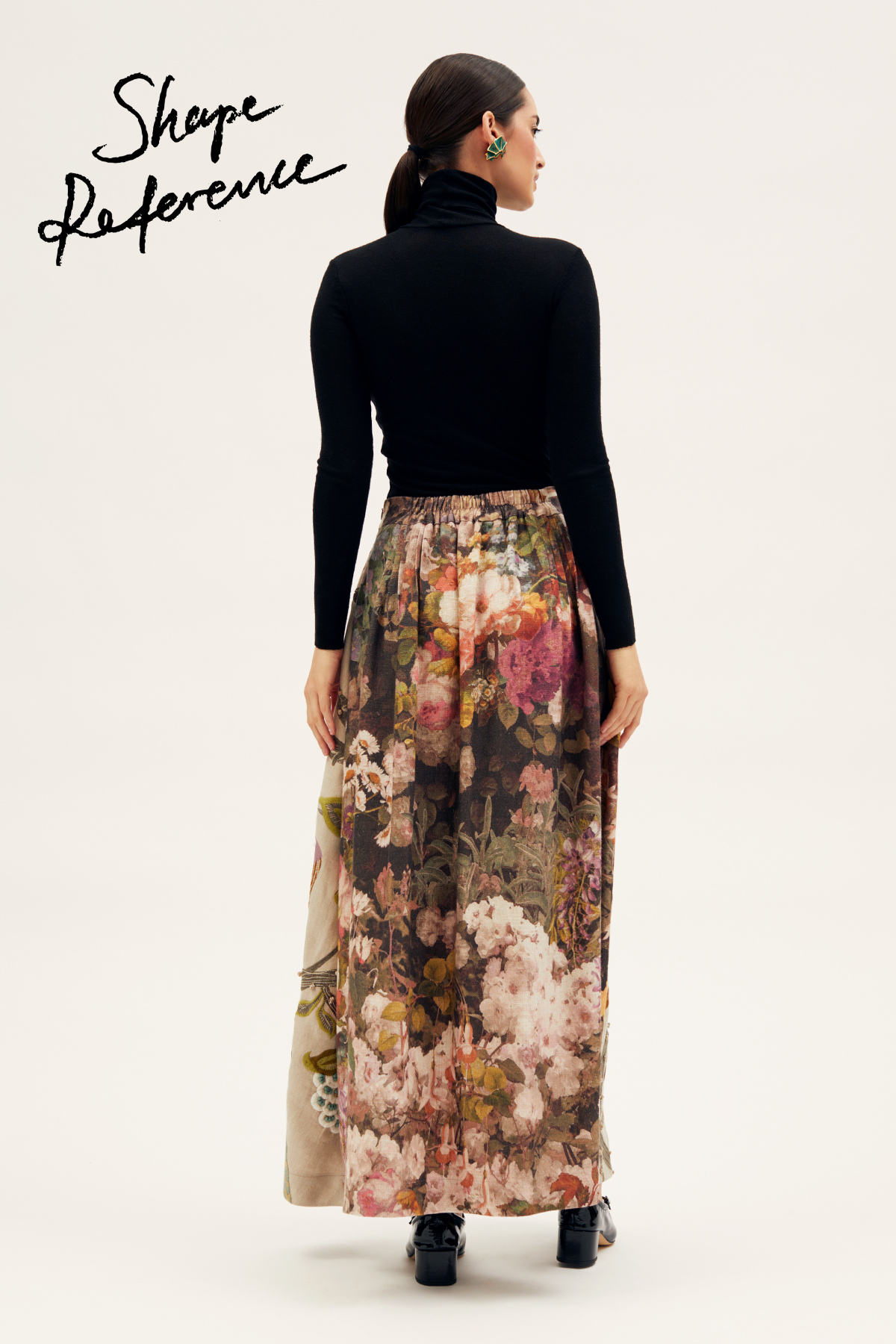 The One-of-a-kind Long Skirt with Tucks Embroidery is an elegant A-line silhouette that combines intricate craftsmanship with timeless design. The front is crafted from a high-end embroidered linen mix fabric, while the back features a contrasting printed linen, creating a harmonious balance of texture and artistry. Delicate tucks at the back add subtle volume and movement, while the structured waistband and side zipper ensure a flattering fit. Designed to sit beautifully at the waist, this piece embodies refined ease and sophisticated charm.