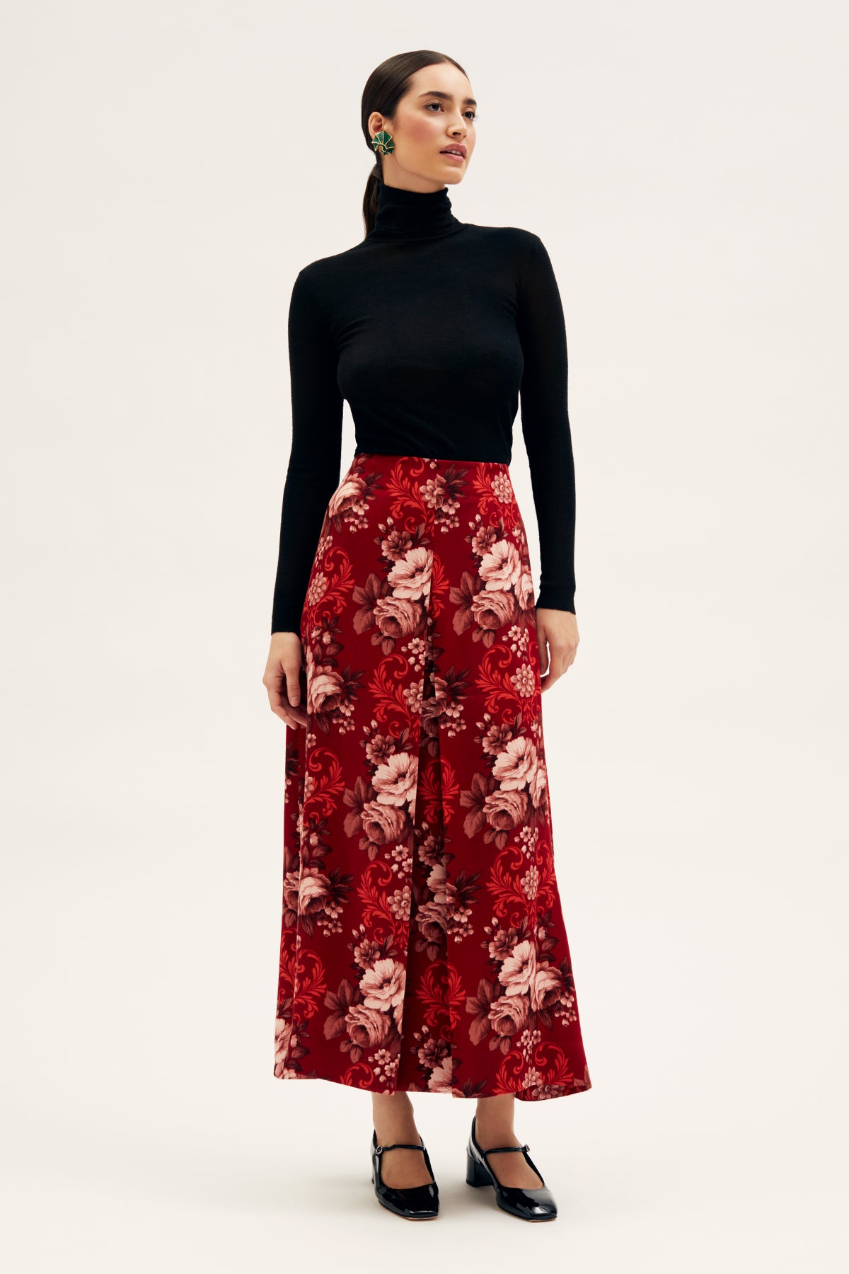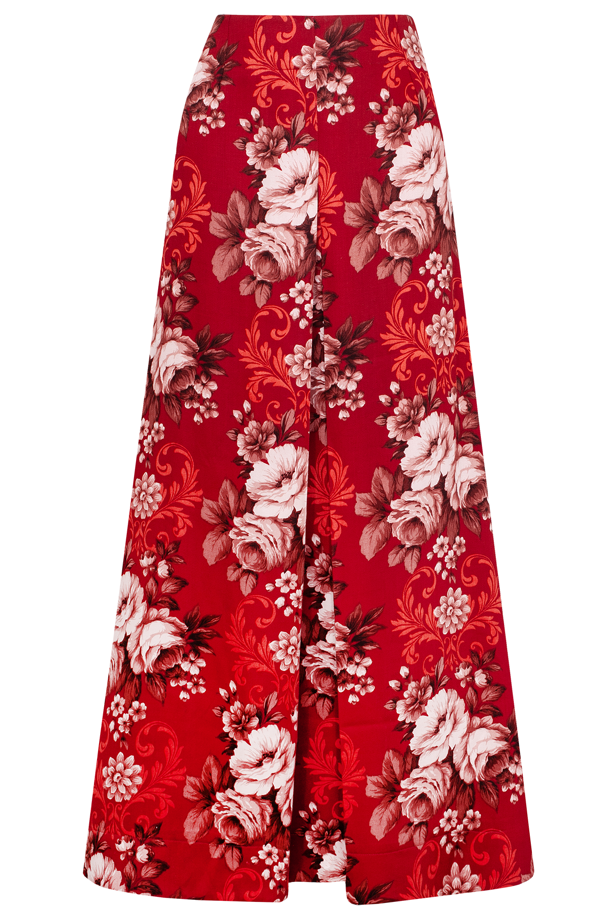 Product Details: Long length, A-line silhouette, front box pleat, waistband, zipper closure, unlined