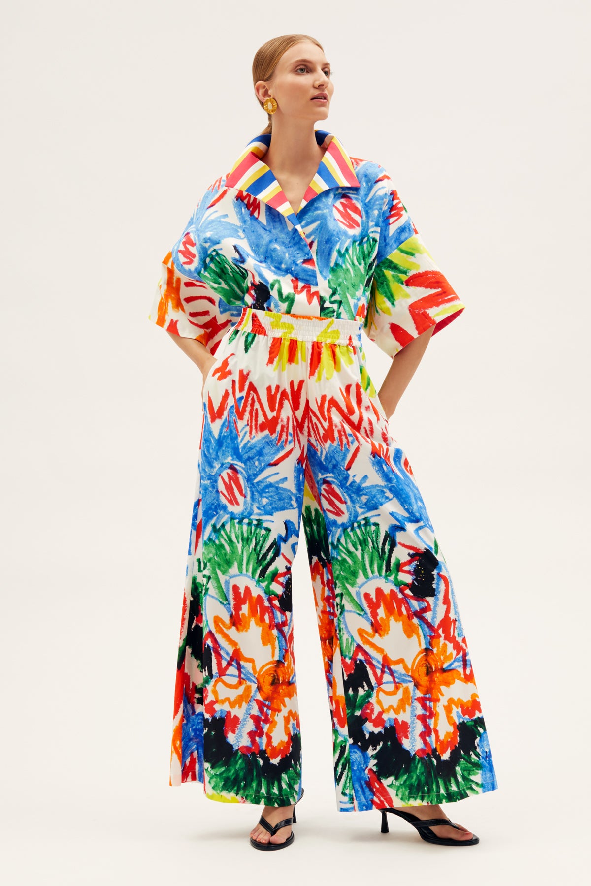 The Tropica Fruta Pants Fyori Popeline presents a wide flowing silhouette defined by a high-rise fit. The elegant yet comfortable cut makes it a perfect pair from day to night. Dress it down with some sandals or make it an evening appearance with heels and a selection of vintage jewelry.